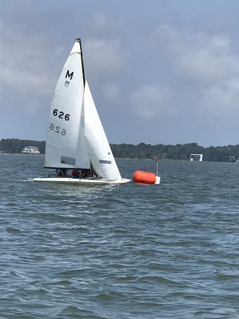 Lyris is a 1983 Johnson M-20 scow (#626) that was updated with a auto tack launch system and asymmetrical spinnaker to compete in Inland20 one design fleets. It includes a number of other upgrades, including stepped mast, foil rudders, windward sheeting car, replaced lines, etc. It comes with a 1990s Bryant aluminum mast (the lightest and best of the aluminum spars), asymmetric spinnaker, a lightly used set of racing sails (Bowers main and jib), and one set of practice sales (main and jib). It also has two covers for in season (mast up – older) and off season (mast down) use. The boat weighs a competitive 616 lbs.